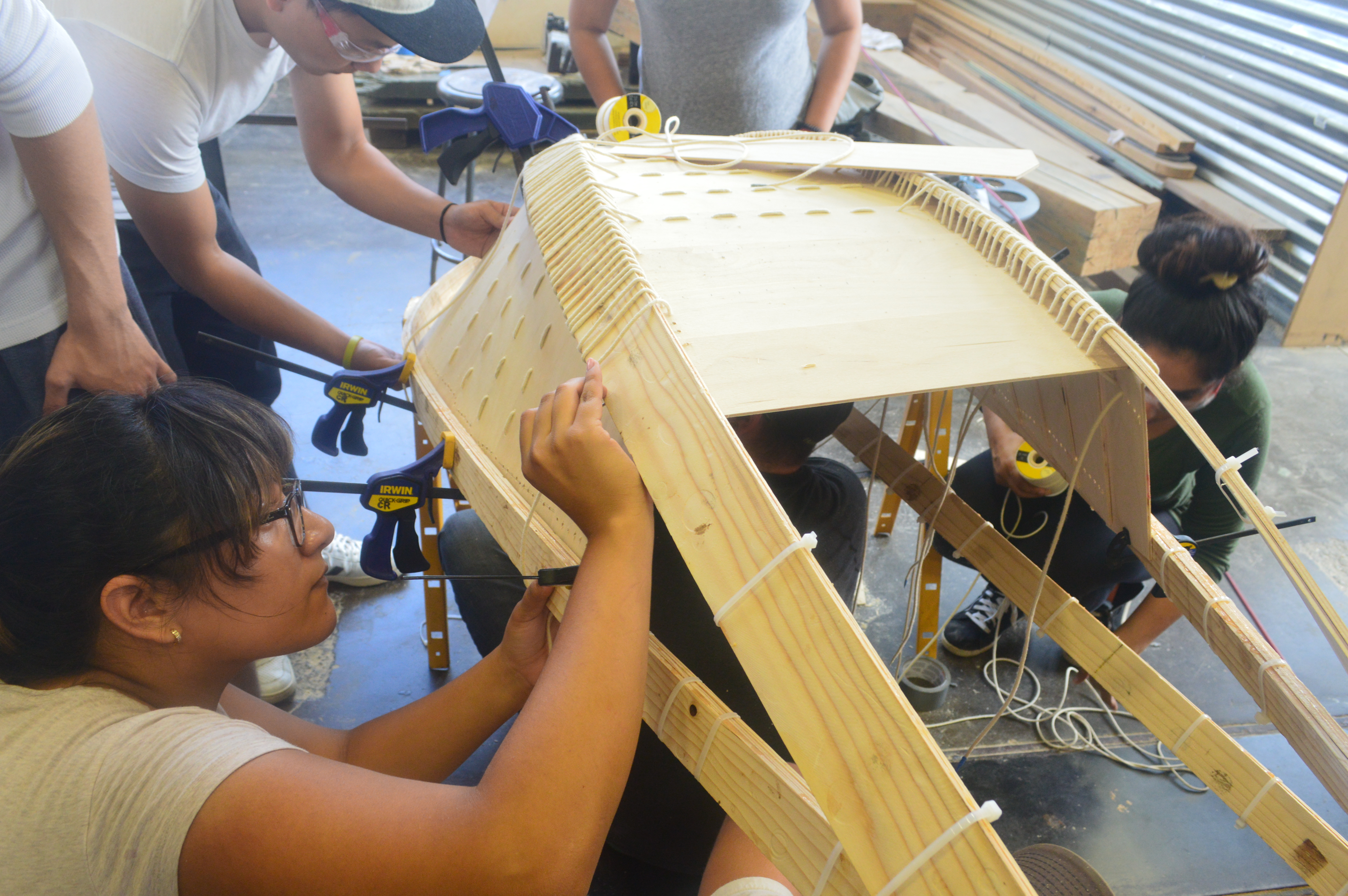 A wooden boat is a deceptively simple example of complex geometries which integrate the structure with a planar enclosure system. The design of Ning Dinghy combined a streamlined modern facade with assembling it by traditional knotting techniques that did not use nails.