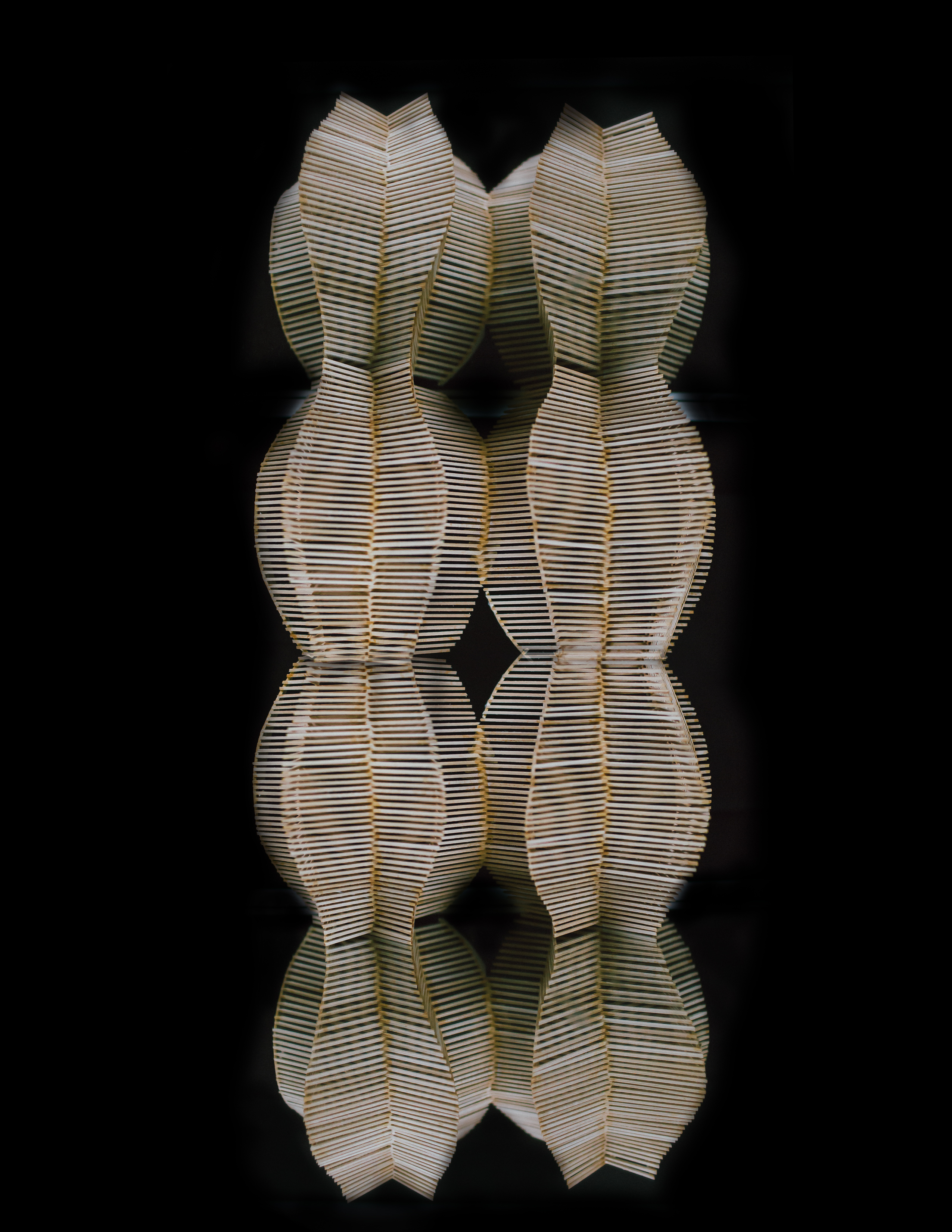 The model of pavilion shows the section drawings above in 3D. In this space, every wall is curve surface, but the timber columns that created the curve are straight. It has one primary space and two secondry space .