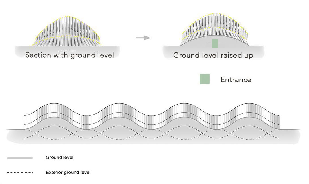 Raise the ground up, follow the wave of the structure, created entrance. People get in through these raised ground instead of break a hole on structure to enter.