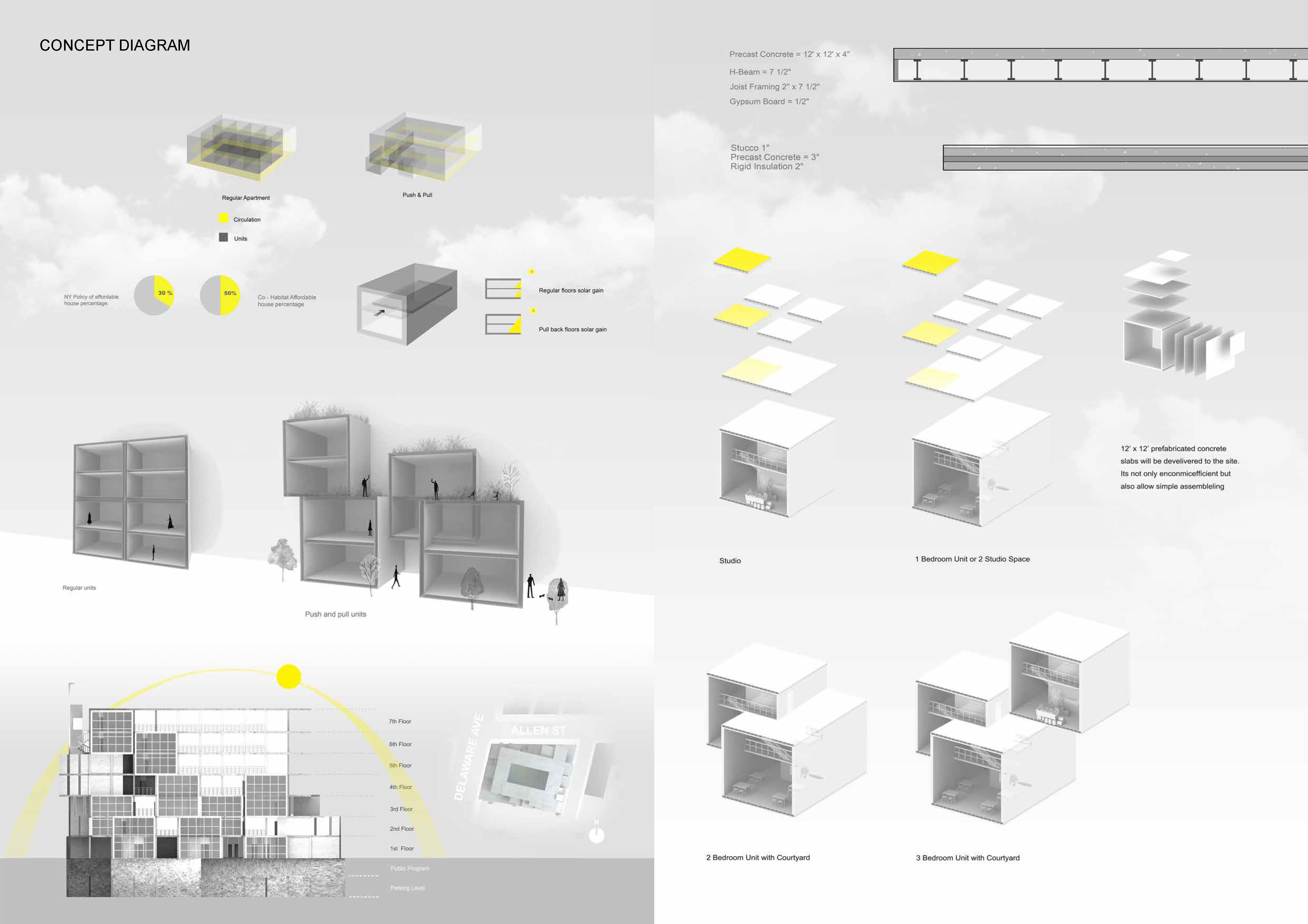 Co-Habitat is a aims to provide a shared community space that houses varied income groups in its residential sand public program. With the rising state of income inequlity, we wanted to break the social barriers so that children and young adults are open to the opportunites of education that may not be provided in the public school system. Both (residential and public) focus on fostering entrepreneurship. The public program- focused on technology and green technology is primarily housed in the courtyard and basement, but is also distributed throughout the "GREEN WALL" in outdoor spaces and green houses. The void spaces include agriculture. In addition, a commercial program is housed at the street level and the top floor UNITS- to bring the larger Buffalo community into the building. To encourage engagement between neighbors and students. Indoor and outdoor courtyard- terraces with educational programming are provided on every level by using a the push-and-pull system of unit aggregation.